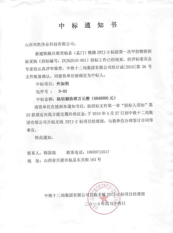 我公司所投新建鐵路呂梁至臨縣(孟門)鐵路ZNTJ-2標段第一次甲控物資招標編號為ZNJK2010-001的外加劑D-02包件已被招標單位接受,被確定為中標單位。