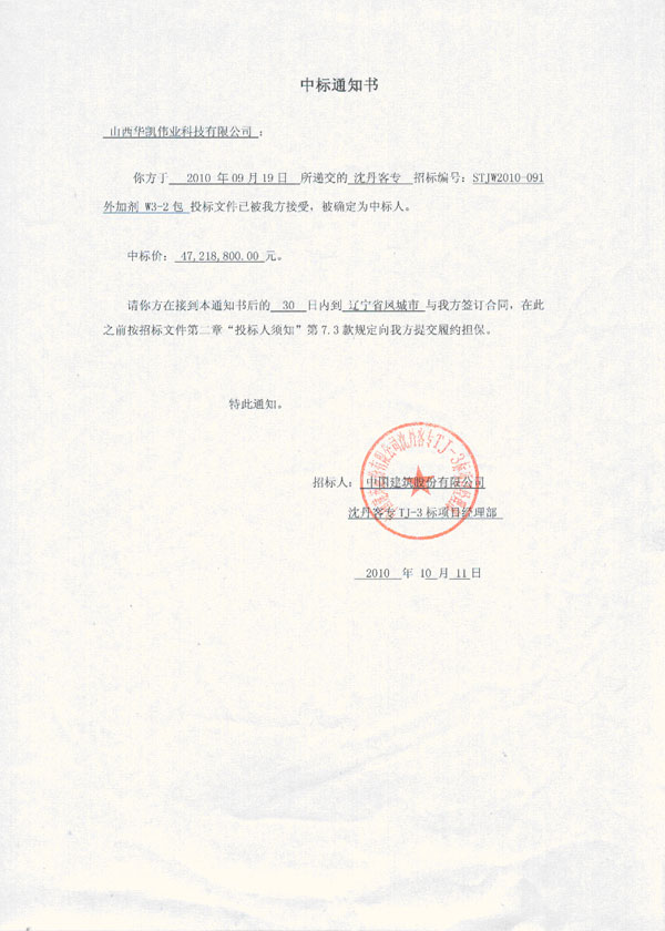 我公司所投沈丹鐵路客運專線招標編號為STJW2010-091外加劑W3-2包件已被招標單位接受,被確定為中標單位。