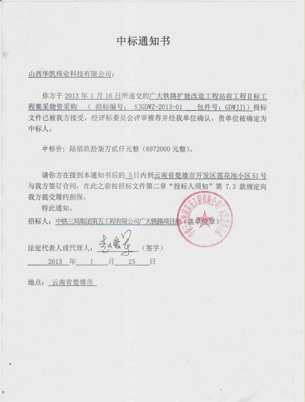 我公司所投廣大鐵路擴(kuò)能改造工程站前工程Ⅱ標(biāo)工程集采物資采購(gòu)招標(biāo)編號(hào)SJGDWZ-2013-01的外加劑GDWJJ1已被招標(biāo)單位接受,被確定為中標(biāo)單位。