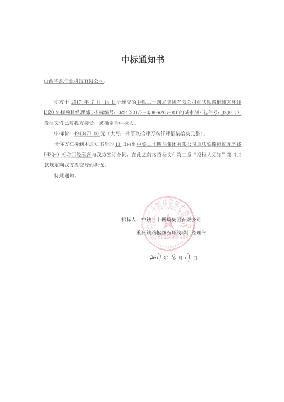 下一篇:恭賀我公司中標中鐵一局集團物資工貿(mào)有限公司臨海東、昌邑南制梁場外加劑采購項目