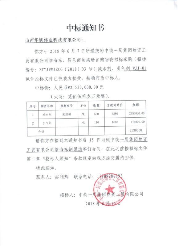 恭賀我公司中標(biāo)中鐵一局集團物資工貿(mào)有限公司臨海東、昌邑南制梁場外加劑采購項目